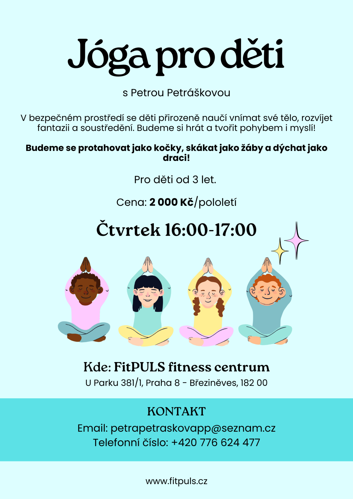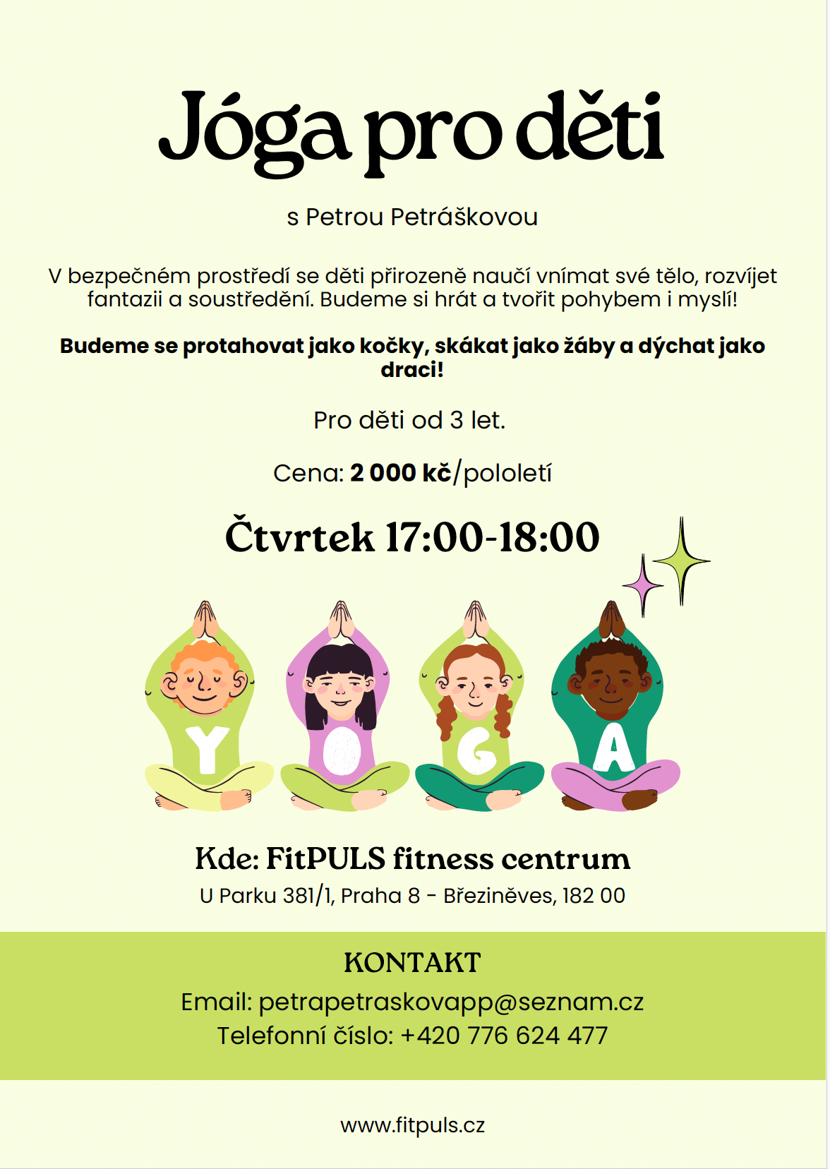 Zájem o dětskou jógu ve FitPULS Březiněves nás opravdu těší. A ještě víc nás těší to, jak si děti lekce s Petrou Petráškovou zamilovaly. Kroužek je dlouhodobě plný a díky skvělým referencím od rodičů i nadšeným reakcím dětí jsme se rozhodli udělat další krok.